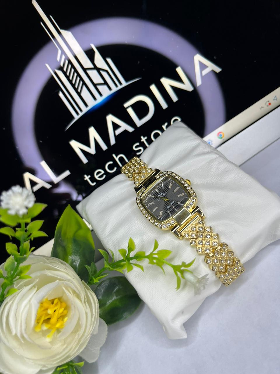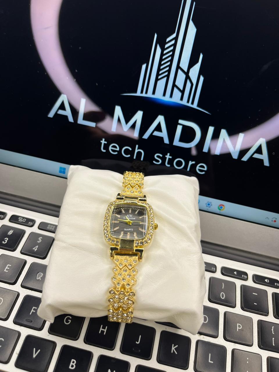 Its gold-plated design is beautifully adorned with sparkling stones.